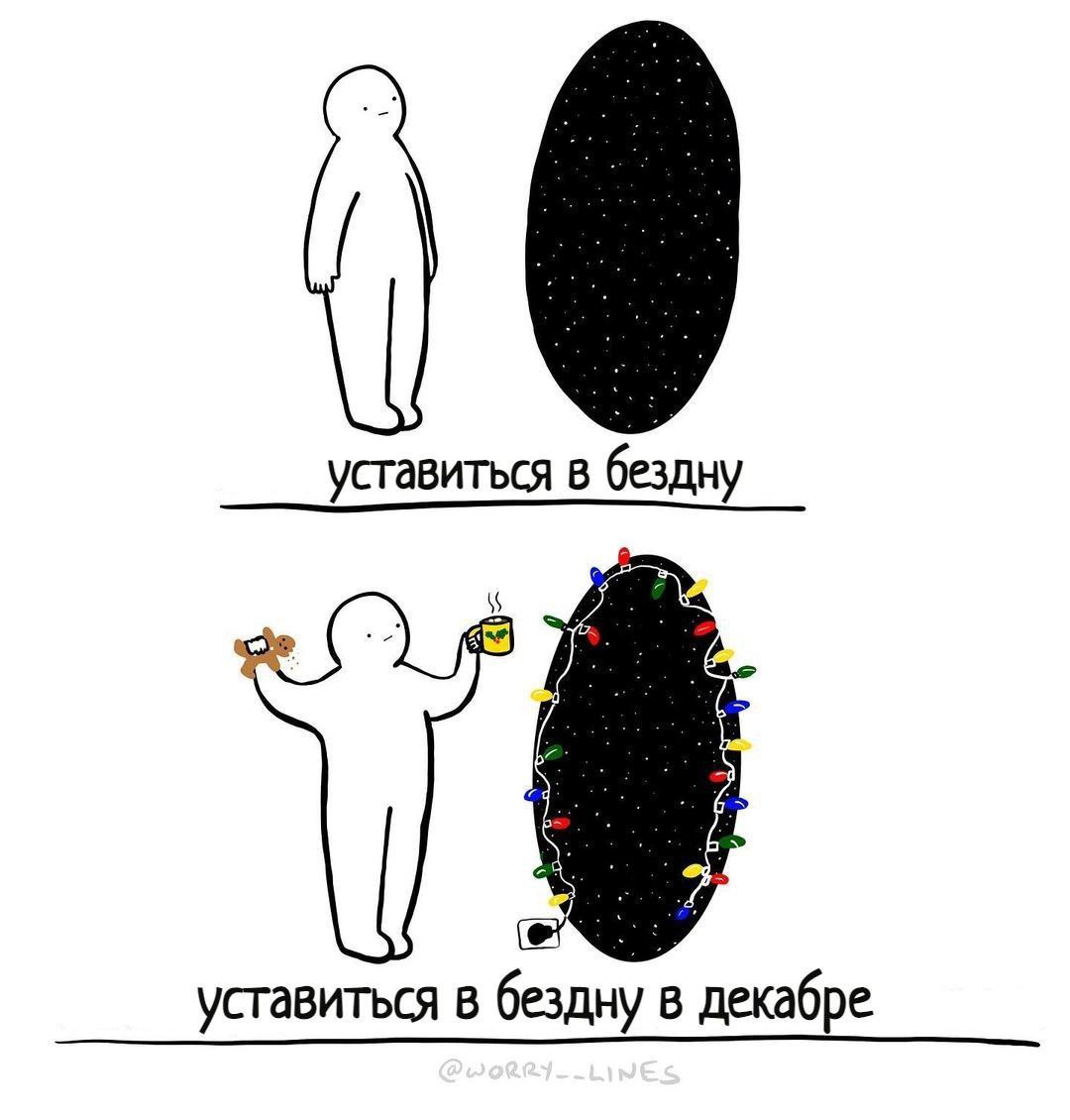 Даже если успеть забиться в тихое местечко, перевести дух и задуматься, то тут как тут вагон экзистенциальной грусти и страха. Новый год — смена периодов, да, формальная, но наша психика любит систематизацию. Подводятся итоги, сознание сталкивается с мыслью о течении времени и неизбежностью смерти. Это больно и очень одиноко.